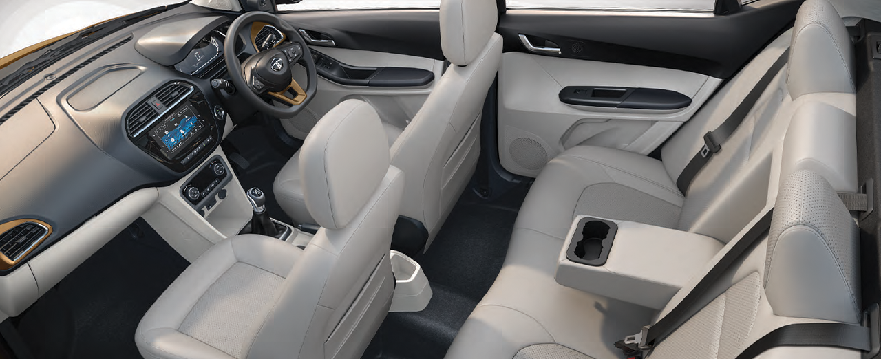 The Tata Tigor boasts a unique and stylish fastback design that sets it apart from the crowd. Its sleek silhouette, complemented by a sporty front grille and projector headlamps, gives it a sophisticated look. Step inside a spacious and modern cabin with premium dual-tone interiors, designed to offer a comfortable and elegant experience for all occupants